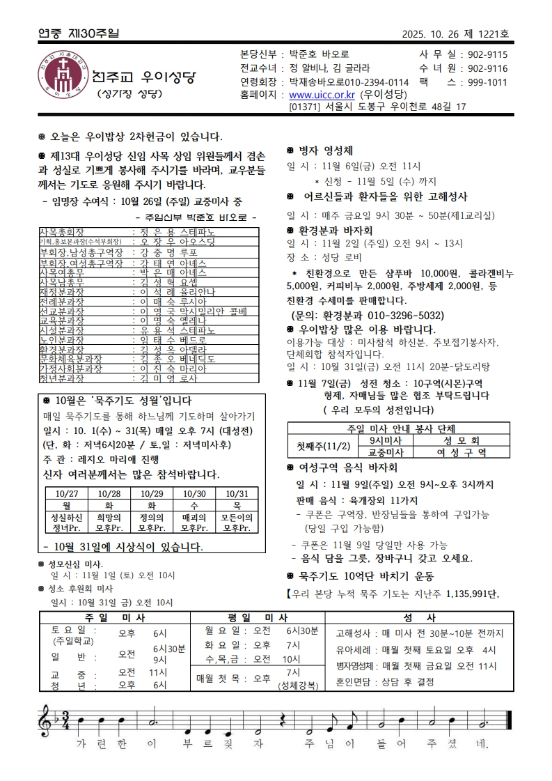 우이주보1221호-2025.10.26 페이지 정보 작성자 우이성당 댓글 댓글 0건 조회Hit 65회 작성일Date 25-10-24 17:14 본문 연중 제30주일 목록 이전글우이주보1222호-2025.11.02 25.10.31 다음글우이주보1220호-2025.10.19 25.10.17