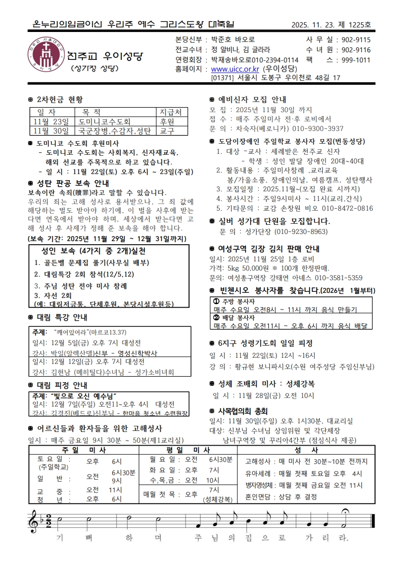 우이주보1225호-2025.11.23 페이지 정보 작성자 우이성당 댓글 댓글 0건 조회Hit 64회 작성일Date 25-11-23 09:56 본문 온누리의 임금이신 우리주 예수 그리스도왕 대축일 목록 이전글우이주보1226호-2025.11.30 25.11.29 다음글우이주보1224호-2025.11.16 25.11.14