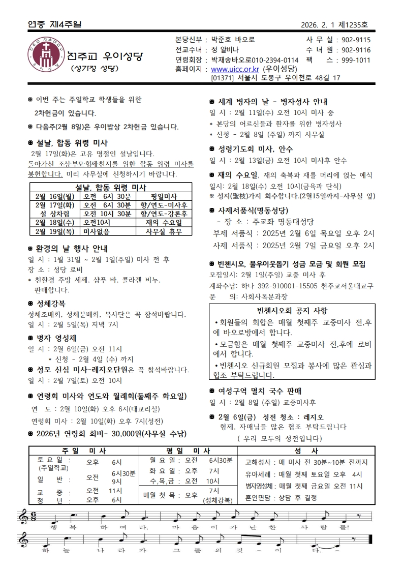 우이주보1235호-2026.02.01 페이지 정보 작성자 우이성당 댓글 댓글 0건 조회Hit 113회 작성일Date 26-01-30 15:24 본문 연중 제4주일 목록 이전글우이주보1236호-2026.02.08 26.02.06 다음글우이주보1234호-2026.01.25 26.01.23