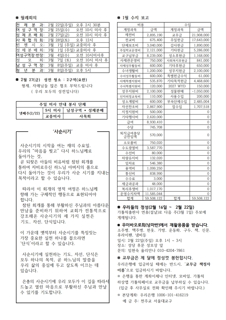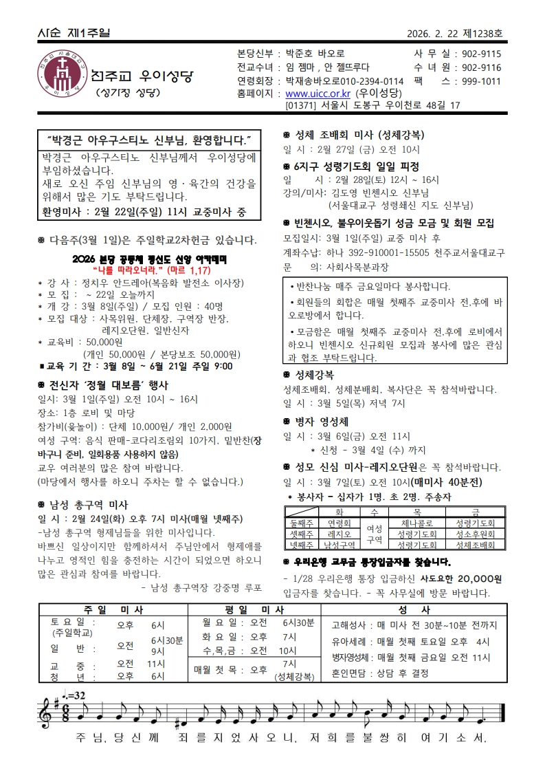 우이주보1238호-2026.02.22 페이지 정보 작성자 우이성당 댓글 댓글 0건 조회Hit 176회 작성일Date 26-02-20 22:05 본문 사순 제1주일 목록 이전글우이주보1239호-2026.03.01 26.02.27 다음글우이주보1237호-2026.02.15 26.02.14