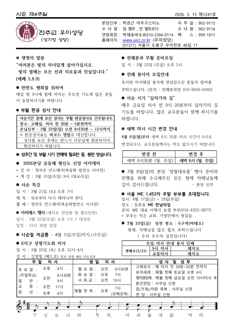 우이주보1241호-2026.03.15 페이지 정보 작성자 우이성당 댓글 댓글 0건 조회Hit 95회 작성일Date 26-03-14 08:36 본문 사순 제4주일 목록 이전글우이주보1242호-2026.03.22 26.03.20 다음글우이주보1240호-2026.03.08 26.03.06