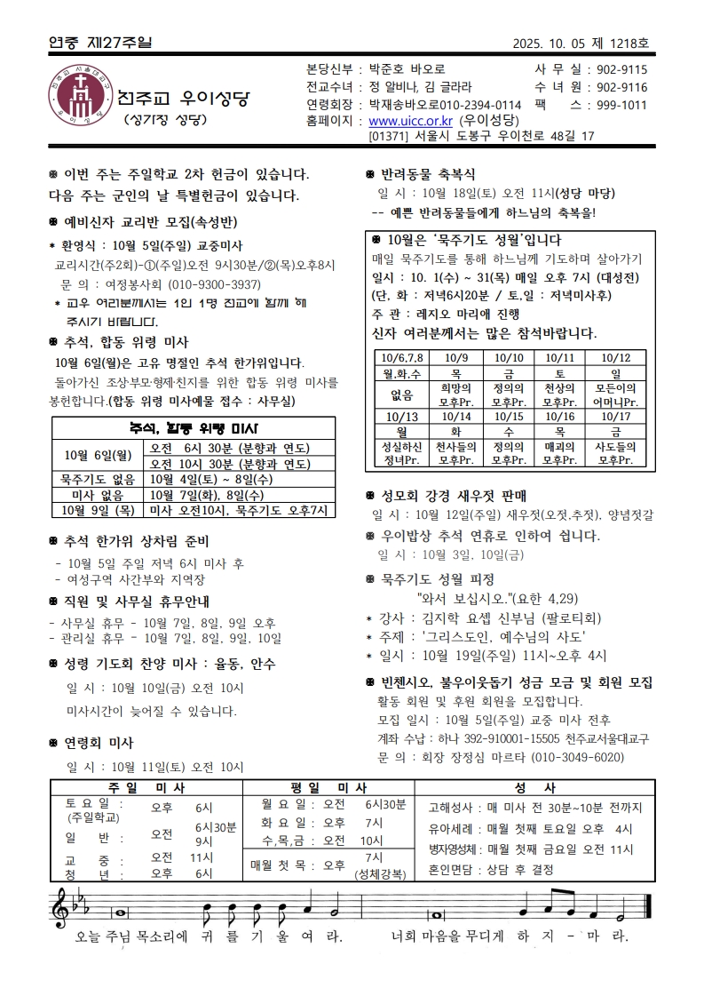 우이주보1218호-2025.10.05 페이지 정보 작성자 우이성당 댓글 댓글 0건 조회Hit 103회 작성일Date 25-10-04 17:16 본문 연중 제 27주일 목록 이전글우이주보1219호-2025.10.12 25.10.09 다음글우이주보1217호-2025.09.28 25.09.26