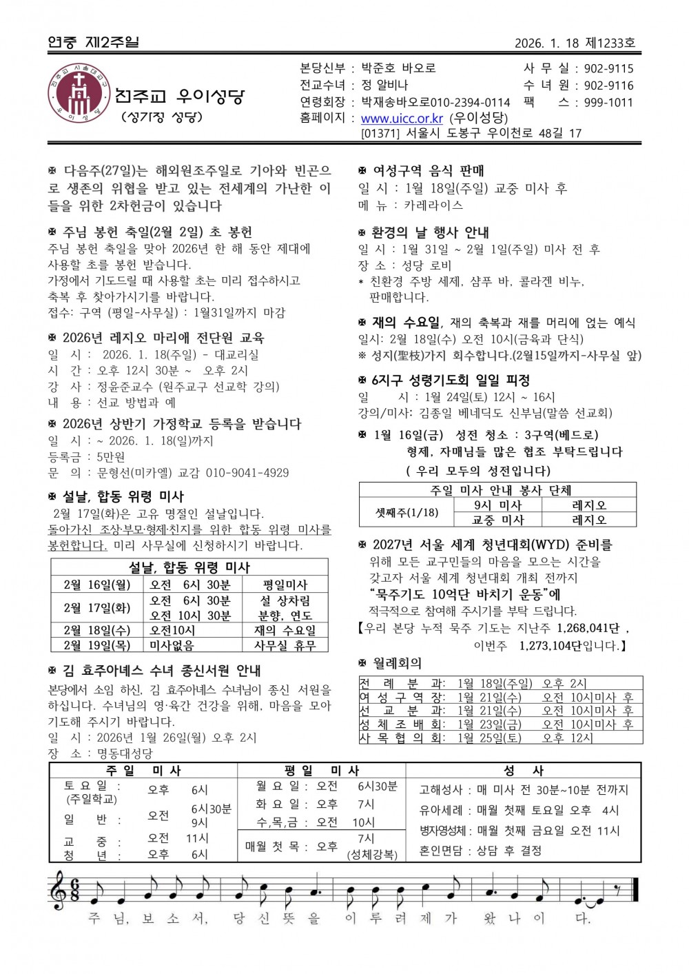 우이주보1233호-2026.01.18 페이지 정보 작성자 우이성당 댓글 댓글 0건 조회Hit 52회 작성일Date 26-01-18 15:29 본문 연중 제2주일 목록 이전글우이주보1234호-2026.01.25 26.01.23 다음글우이주보1232호-2026.01.11 26.01.09