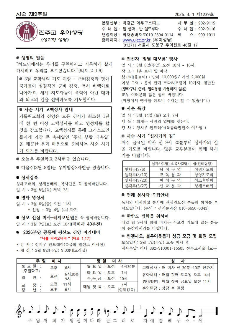우이주보1239호-2026.03.01 페이지 정보 작성자 우이성당 댓글 댓글 0건 조회Hit 153회 작성일Date 26-02-27 14:55 본문 사순 제2주일 목록 이전글우이주보1240호-2026.03.08 26.03.06 다음글우이주보1238호-2026.02.22 26.02.20