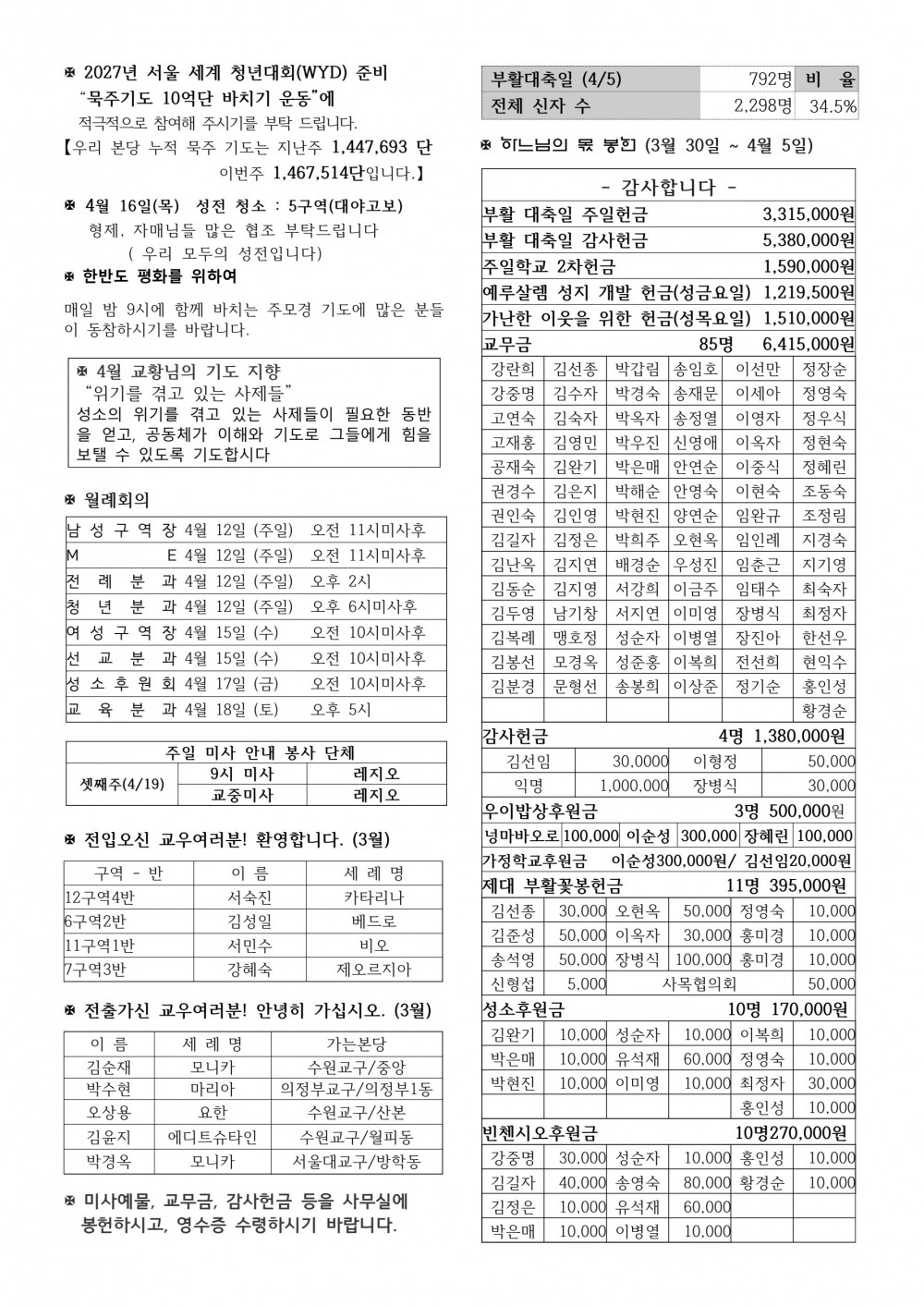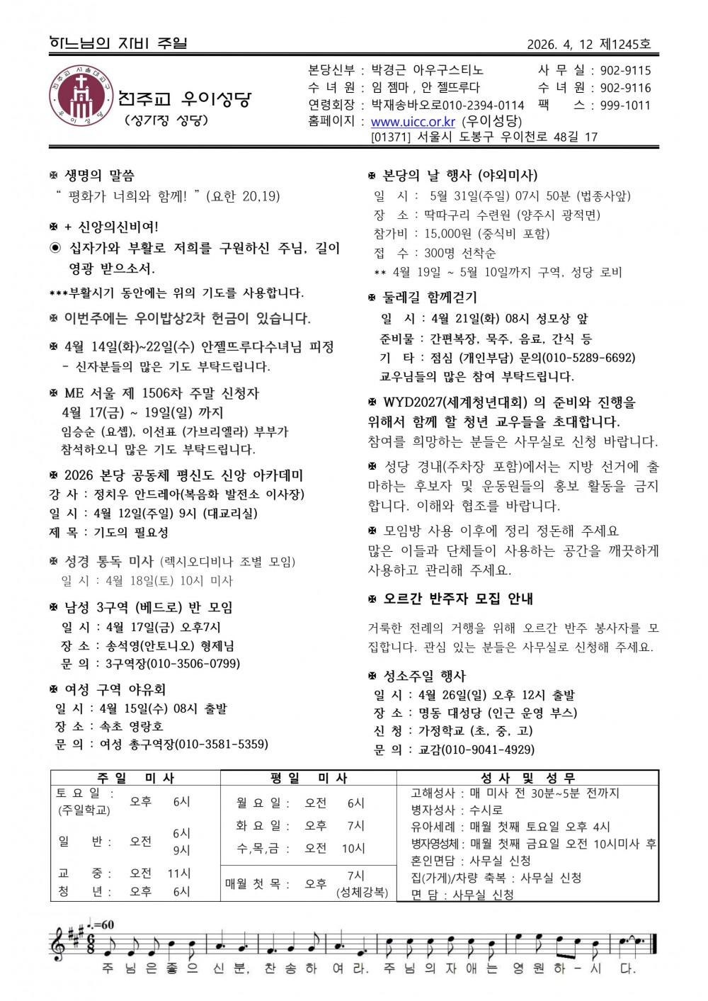 우이주보1245호-2026.04.12 페이지 정보 작성자 우이성당 댓글 댓글 0건 조회Hit 84회 작성일Date 26-04-11 09:00 본문 하느님의 자비 주일 목록 이전글우이주보1246호-2026.04.19 26.04.17 다음글우이주보1244호-2026.04.05 26.04.04